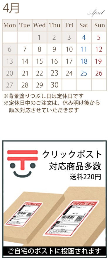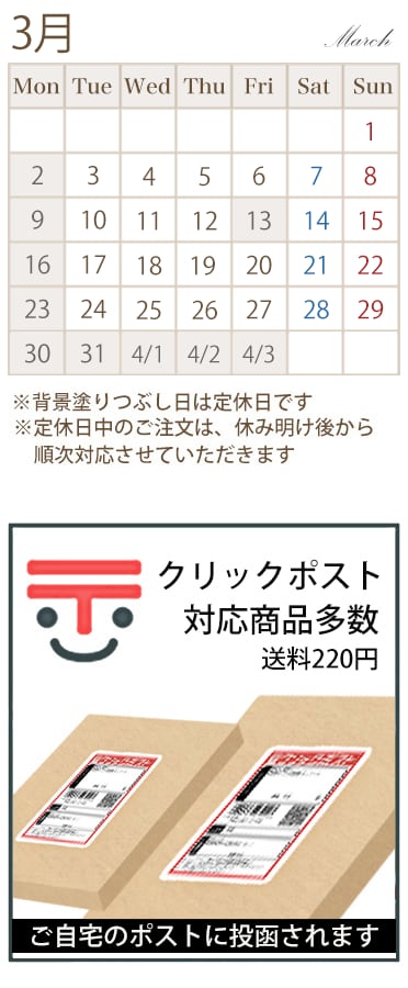 - 【お知らせ】 毎週月曜に加え、3/31~4/3は定休日です。3/28のお昼12時以降にご注文いただきました分は4/5~順次発送となります。ご了承くださいますようお願いいたします。