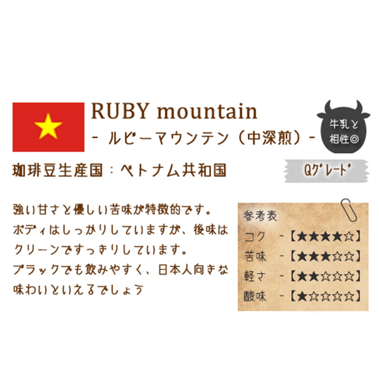 強い甘さと優しい苦味が特徴的です。ボディはしっかりしていますが、後味はクリーンですっきりしています。ブラックでも飲みやすく、日本人向きな味わいといえるでしょう。