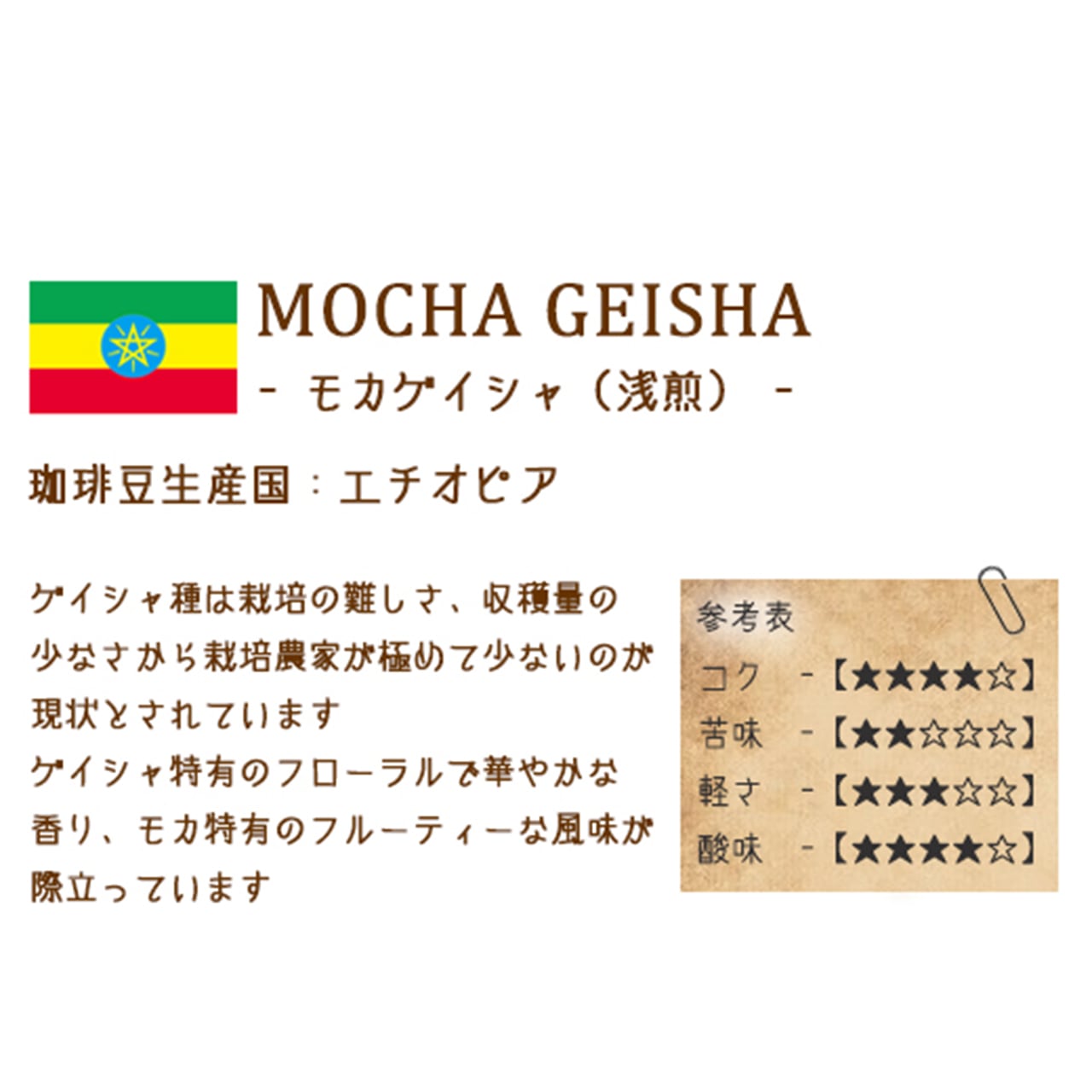 ゲイシャ特有のフローラルで華やかな香り、モカ特有のフルーティーな風味が際立っています。
