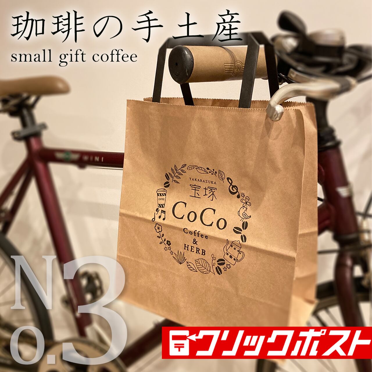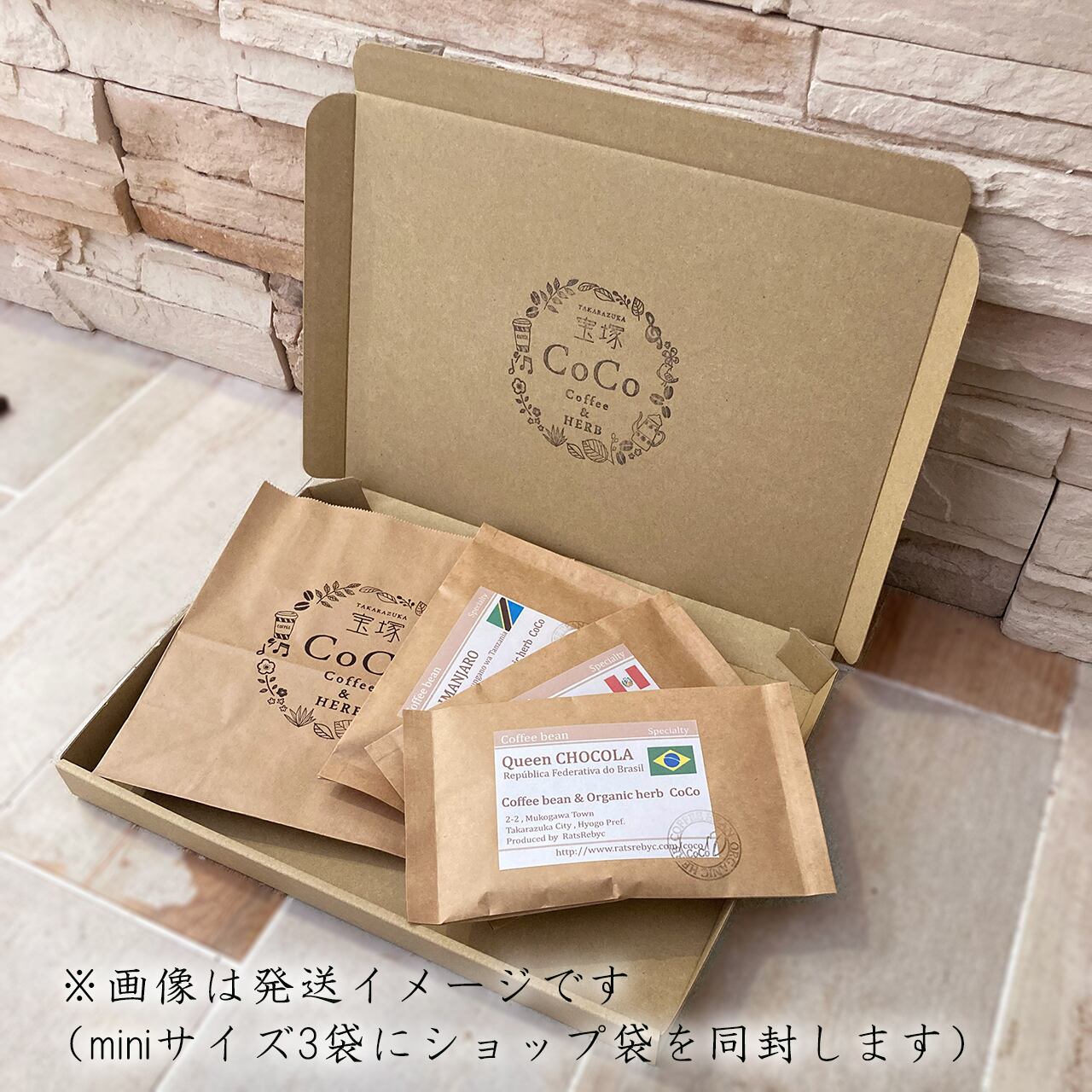 3種類のminiサイズ珈琲とショップ袋を同封してお送りします。